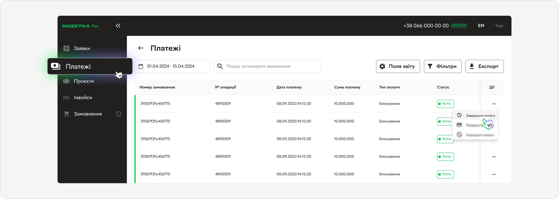 - У меню обираємо розділ Платежі. Після чого у рядку з успішною операцією “Блокування” потрібно натиснути на три точки і вибрати Завершити оплату