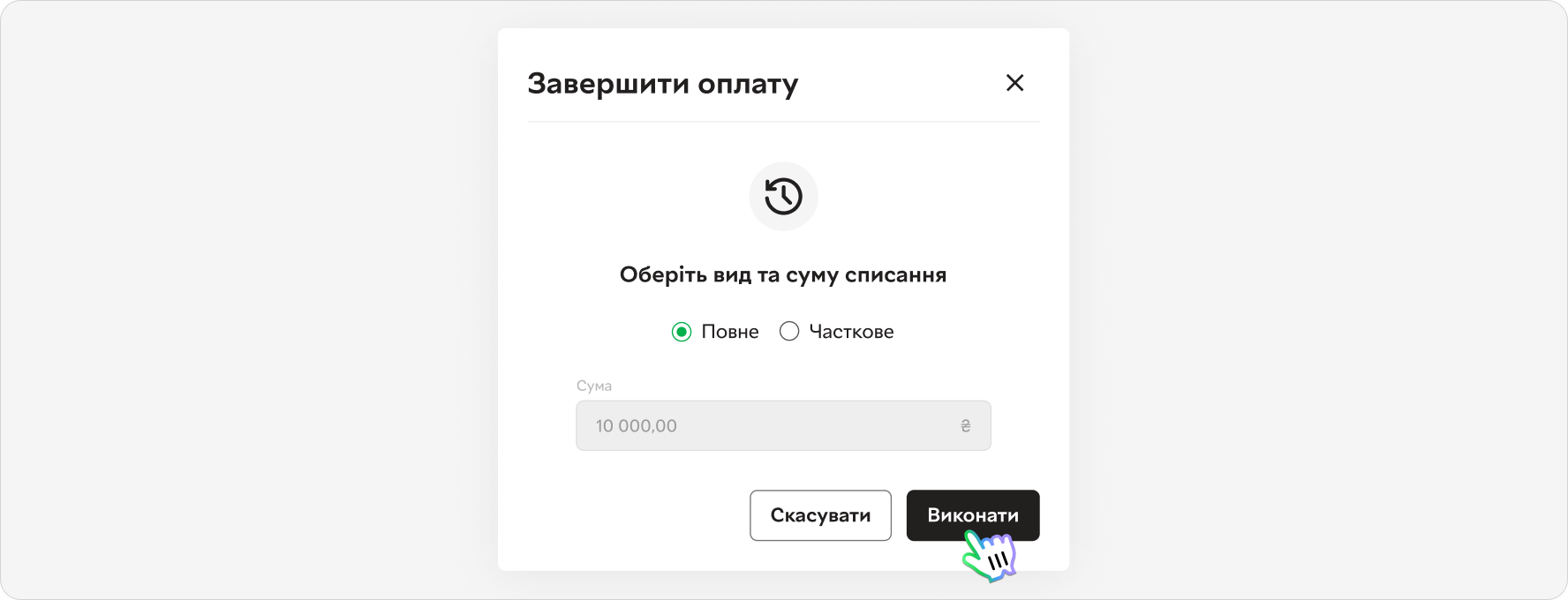 - Якщо потрібно списати частину суми, слід обрати варіант Часткове та у рядку Сума вказати необхідну для списання суму, клікнути Виконати (різниця між операціями Блокування та Оплата автоматично розблокується на картці покупця в момент проведення часткової оплати):