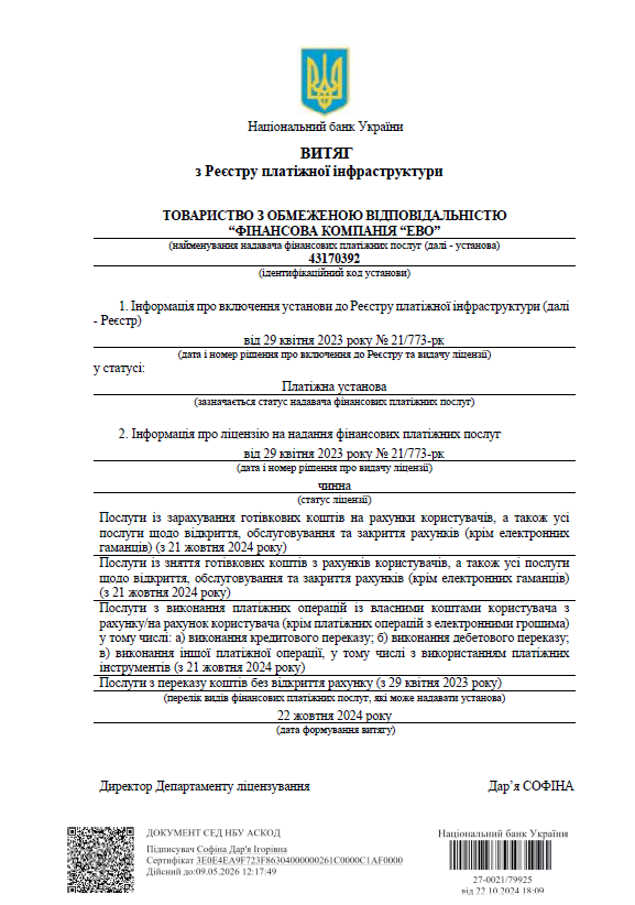| 2. | послуги із зарахування готівкових коштів на рахунки користувачів, а також усі послуги щодо відкриття, обслуговування та закриття рахунків (крім електронних гаманців) | 21/773-рк | 21.10.2024 | Реєстр платіжної інфраструктури |